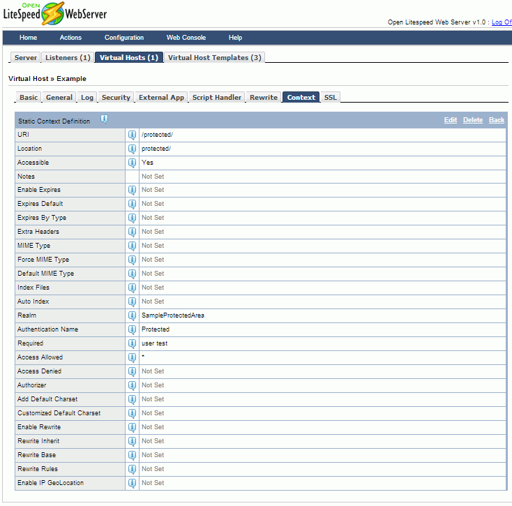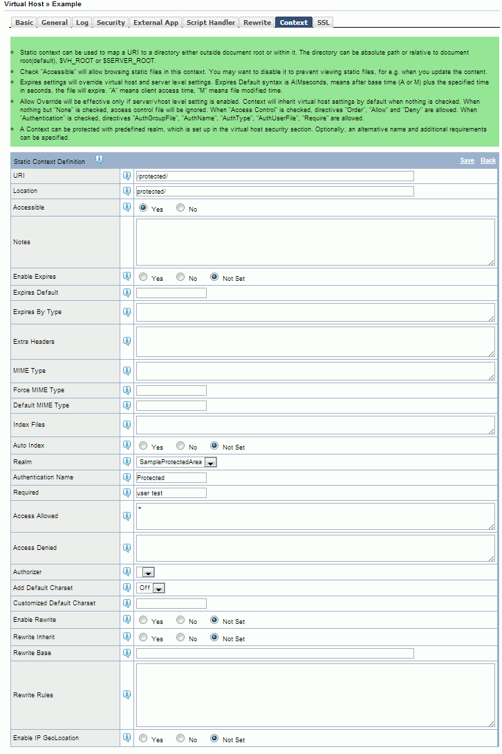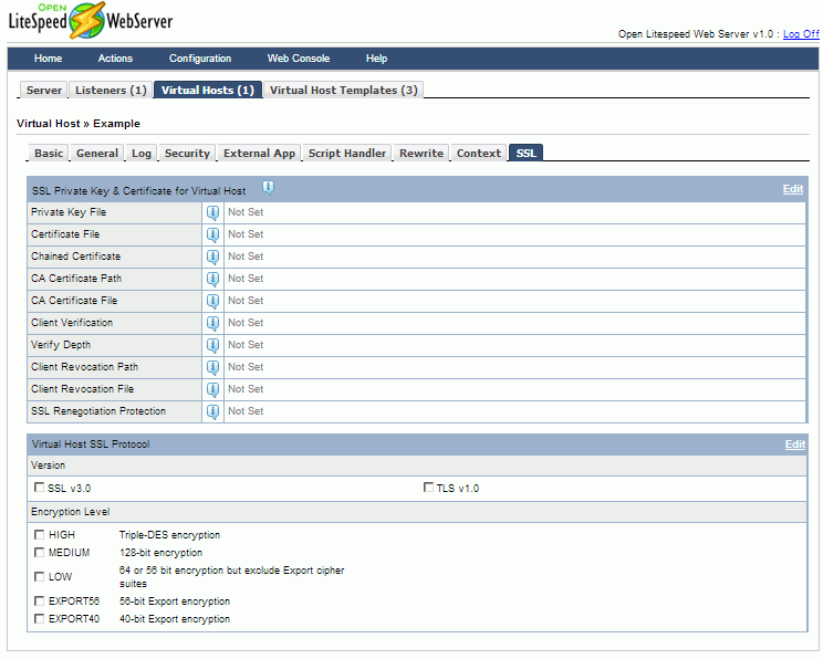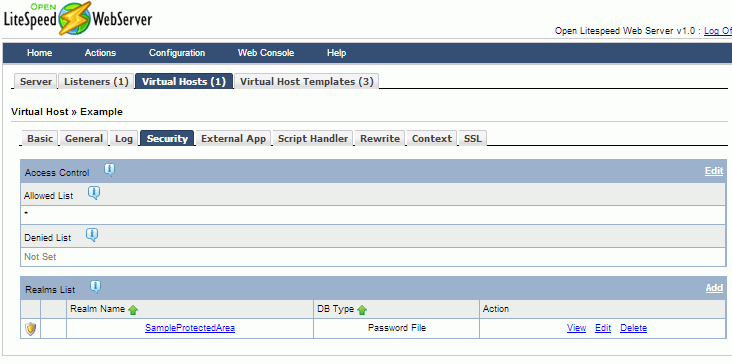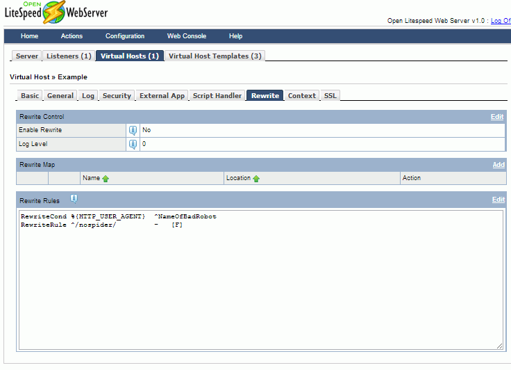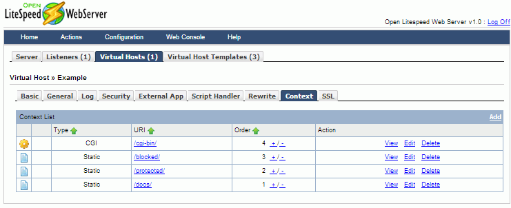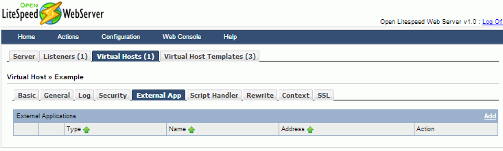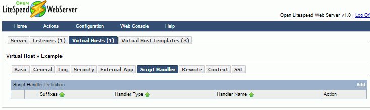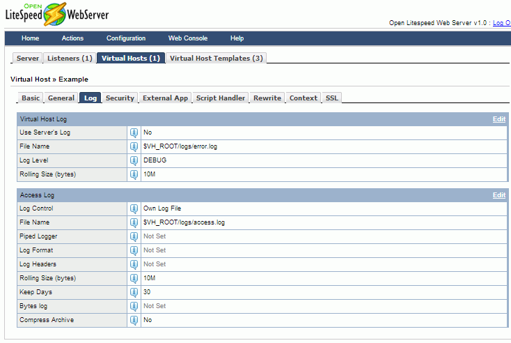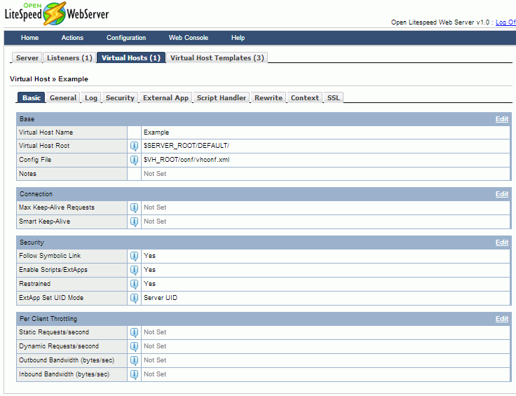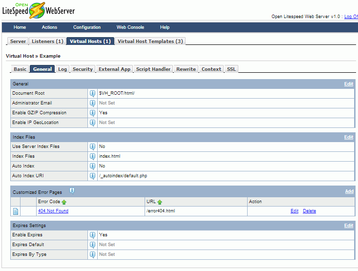 Below are screenshots of OpenLiteSpeed’s VirtualHost GUI based admin control panel – this is the default example VHOST that comes with OpenLiteSpeed install.